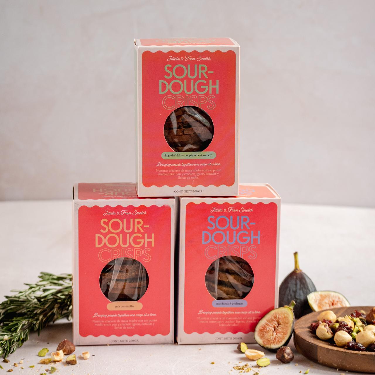Un bundle que reúne 3 crisps artesanales de masa madre, horneadas lentamente para lograr una textura ligera, crujiente y dorada.
