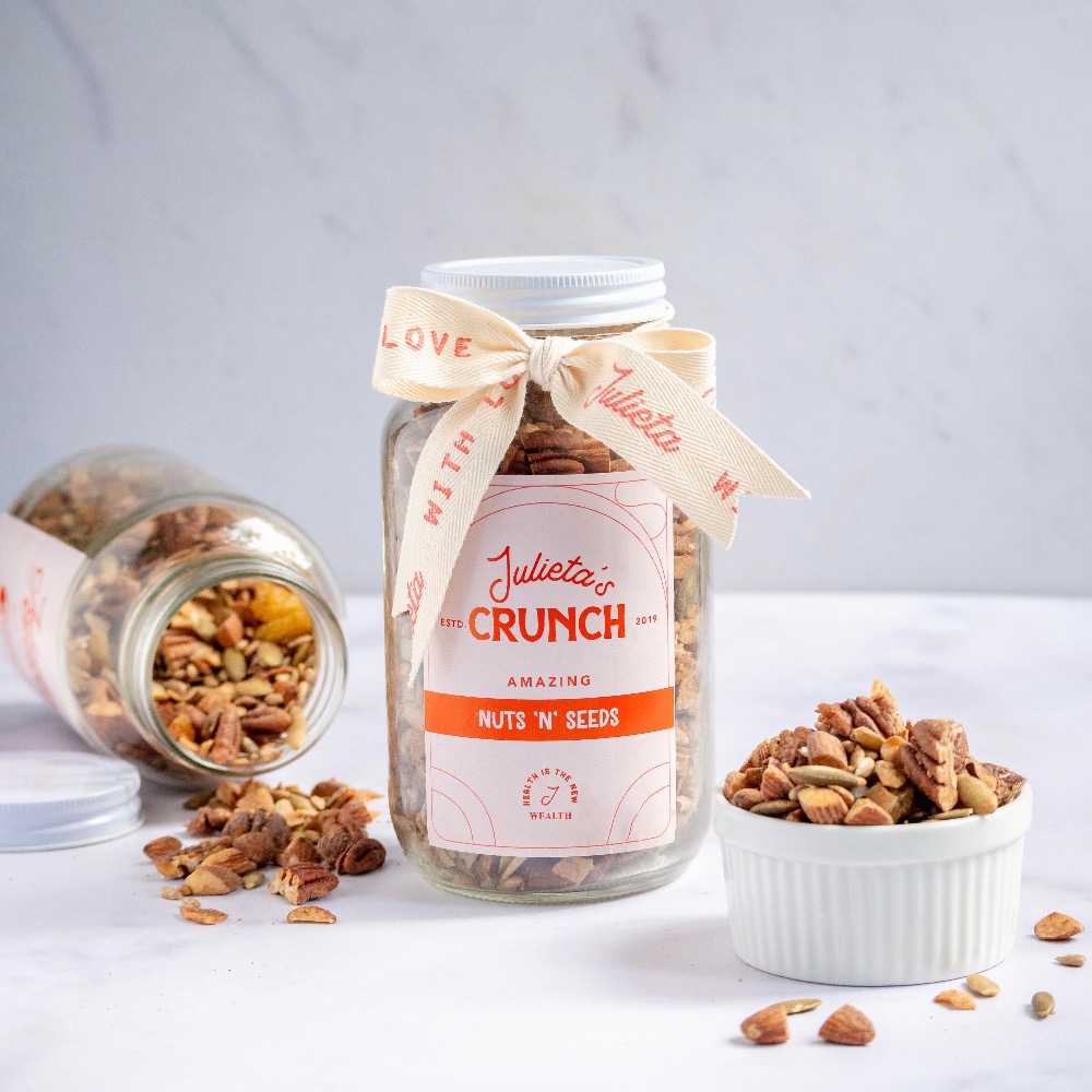 Julieta´s Crunch es nuestra nueva linea de snacks saludables, asesoradas por Valeria Iriarte, experta en alimentación y longevidad. Te traemos Nuts n´Seeds, una mezcla de puras nueces y semillas orgánicas, con muchaaa canela, es KETO, PALEO, GLUTEN FREE y NO CARB.